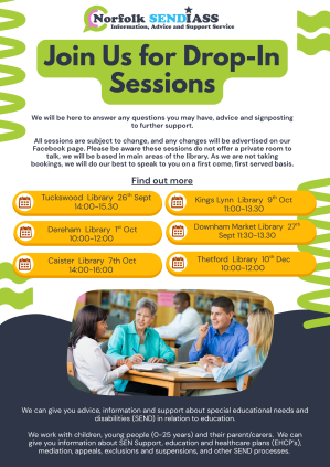 Library drop-ins are picking up, with many parent carers popping along for a chat. We have visited lots of libraries across Norfolk and have had the pleasure of joining in with several Bounce and Rhyme sessions – it’s always great to start the day singing nursery rhymes! We have often been joined by the Family Hubs teams in the different areas, who are able to talk to the parents about their service too. Don’t forget to follow our Facebook page (just search for Norfolk SENDIASS) so that you can keep up to date with where we will be. These sessions are informal and friendly, our Engagement and Advice Workers can give you next steps advice about your child’s education, SEN Support, EHCP and other SEND processes. We will be in the main areas of the library, just look out for our banner!